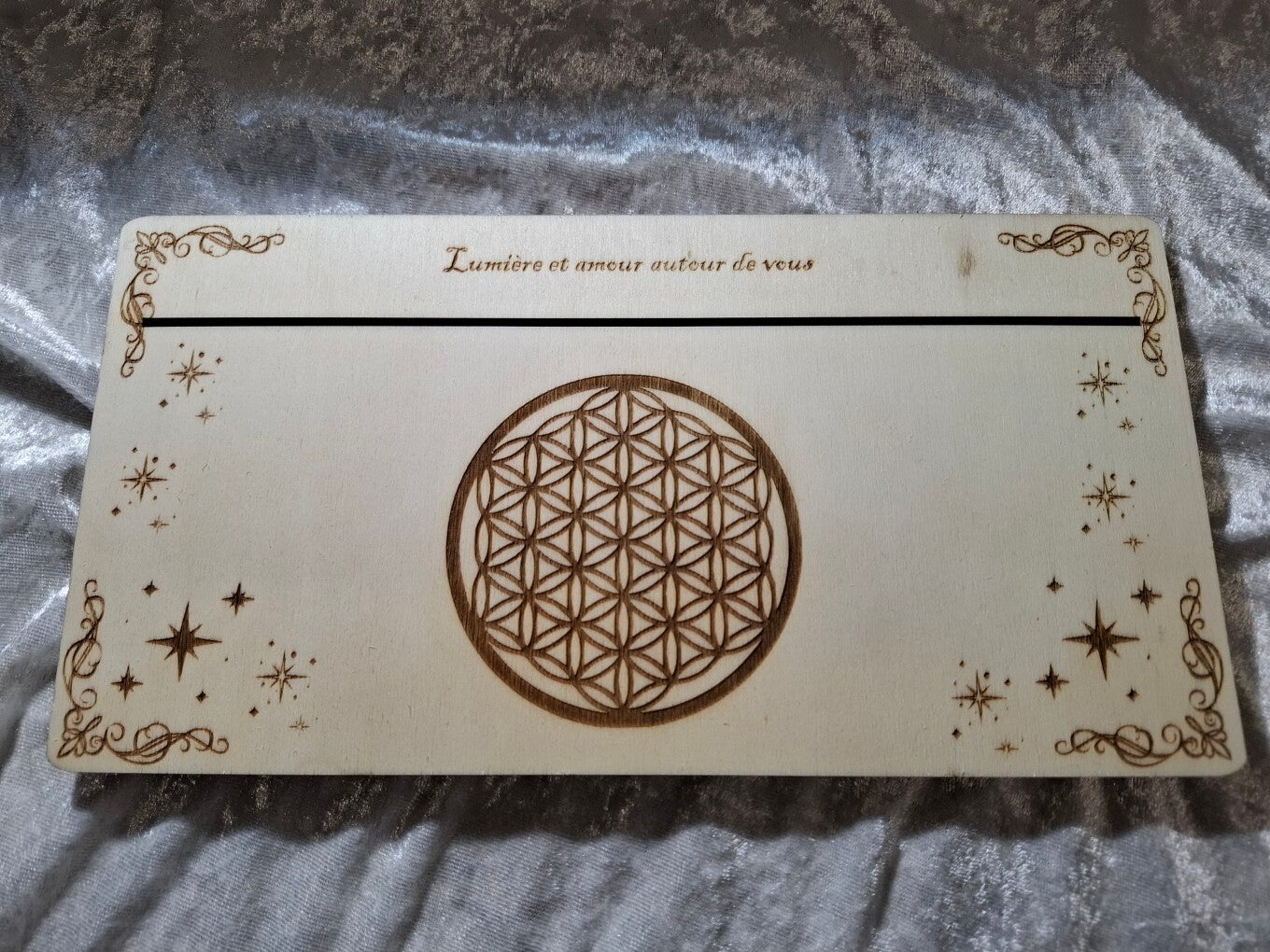 Planche à oracle en bois avec une onde de forme fleur de vie gravé pour la protection.
