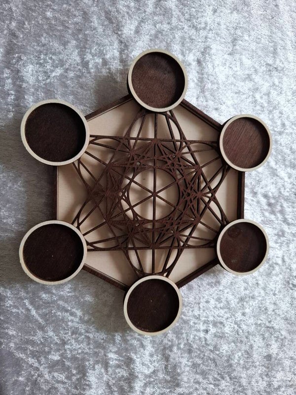 Support Métatron accompagnés de 6 pierres roulées en oeil de tigre et d'un obélisque en cristal de roche. Matière en bois de peuplier pour Métatron. La photo est une présentation. Selon l'arrivage des pierres et obélisques le poids et les formes de chacunes peuvent variés.