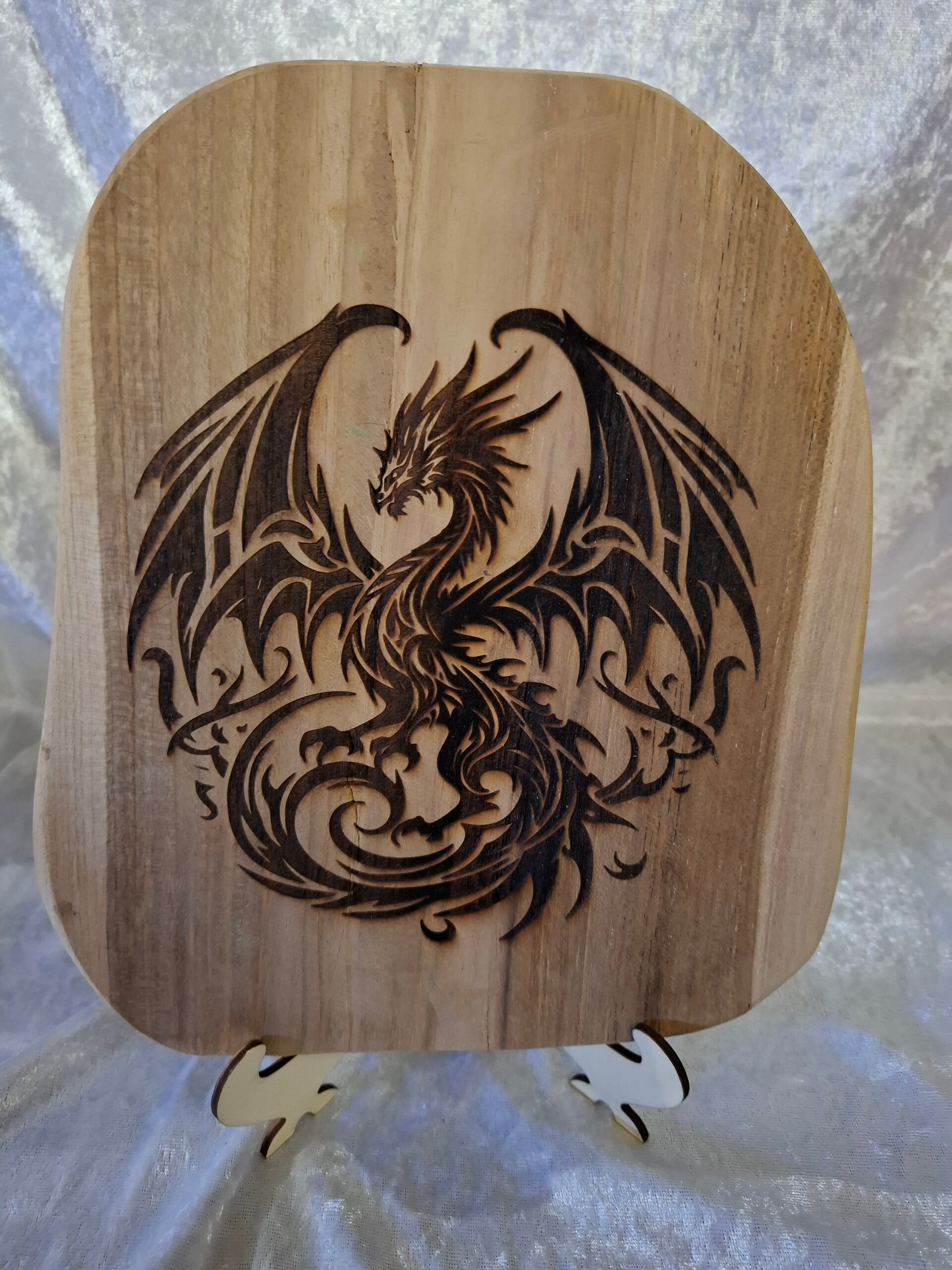 Cadre en bois exotique et son socle en peuplier avec un gravure de tête de dragon.