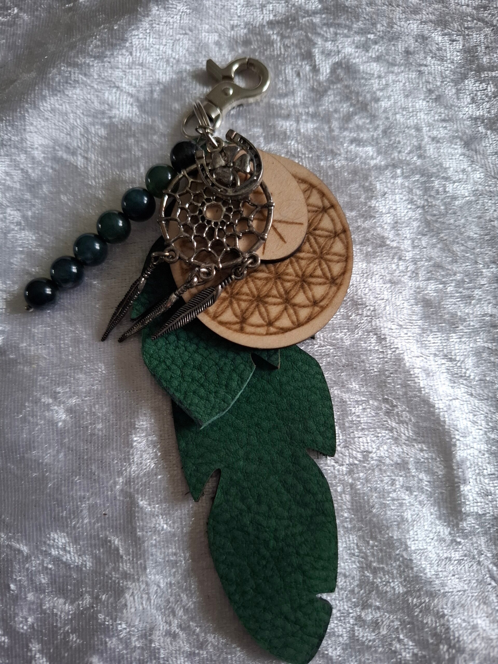 Porte clé protection en agate mousse de 7 perles naturelles et véritables, accompagné de 2 plumes en daim vert foncé, un pendentif chakras et ou un attrape rêves et d'un petit pendentif porte bonheur, d'une rune et d'un symbole de géométrie sacré qui apporteront la protection.