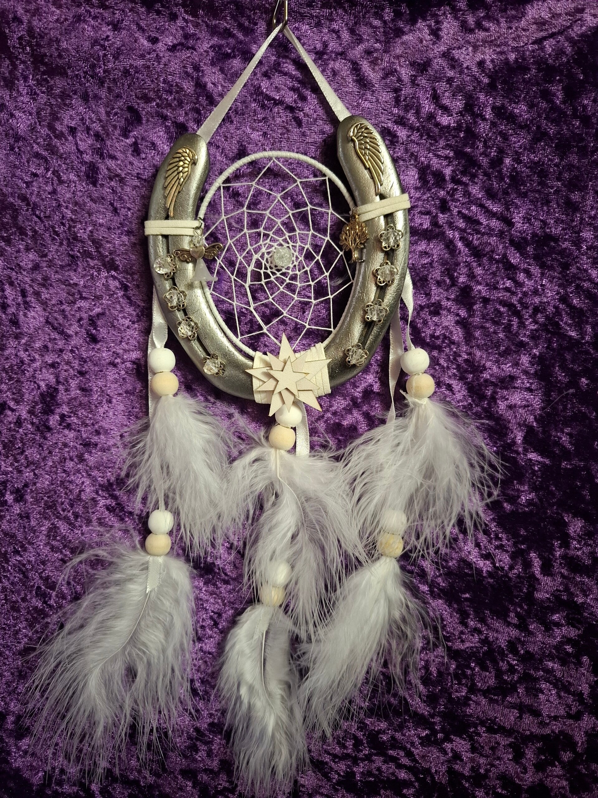Attrappe rêves dans un fer à cheval qui a été porté par un équidé, nettoyé et vernis. Il se compose de perles en verre et bois. Plumes dans les tons blanc